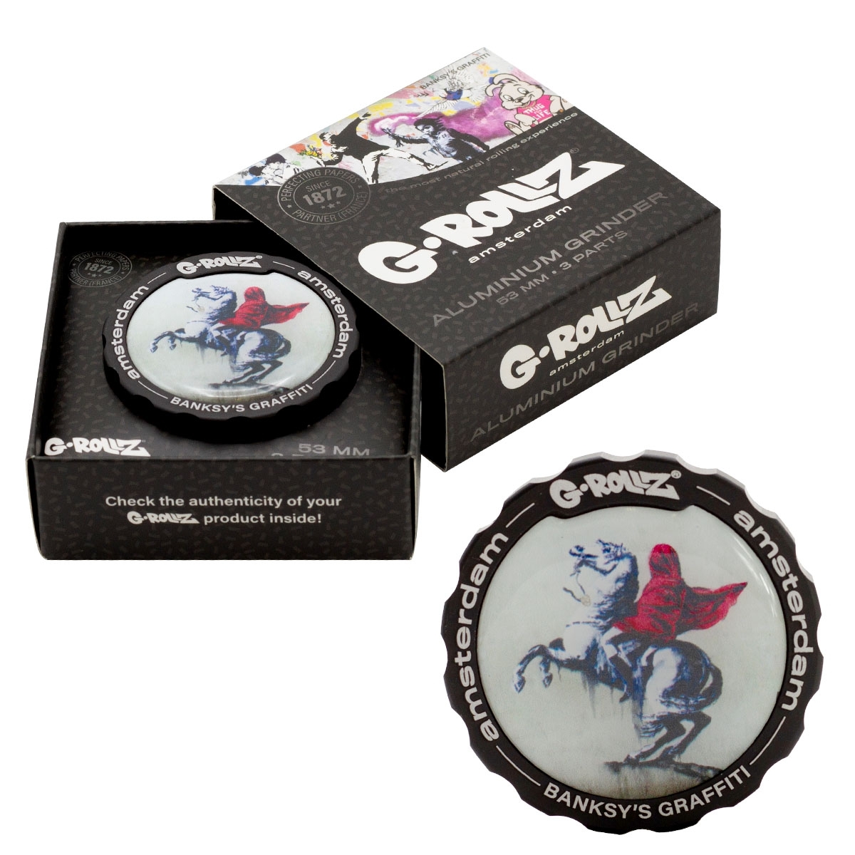 The G-ROLLZ Banksy Graffiti 3-part Grinder, with a 53mm diameter, is perfect for effortlessly processing your herbs. This sturdy grinder comes in a 6-piece display and features razor-sharp teeth for seamless operation, along with a pollen catcher. A standout aspect is the magnetic sticker on top, which allows users to customize their grinder with any design from our website.