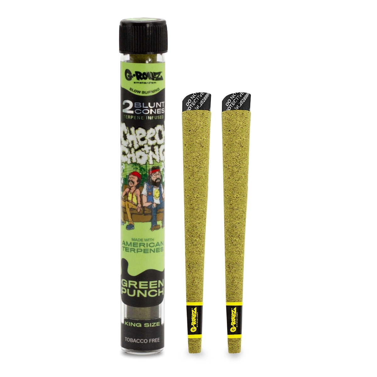 Introducing the exclusive cone cone collection designed by G-Rollz in collaboration with the iconic Cheech and Chong. G-Rollz cones are crafted from post-extraction USA-grown flower and infused American made terpenes. Available in 8 distinct options to satisfy every preference. Each air-tight glass tube contains 2 cones (featuring the G-Rollz patented cone protector for protection and easy filling). One display contains 12 glass tubes, shelf-ready for your stores. Tobacco & nicotine free. Variety: Green Punch