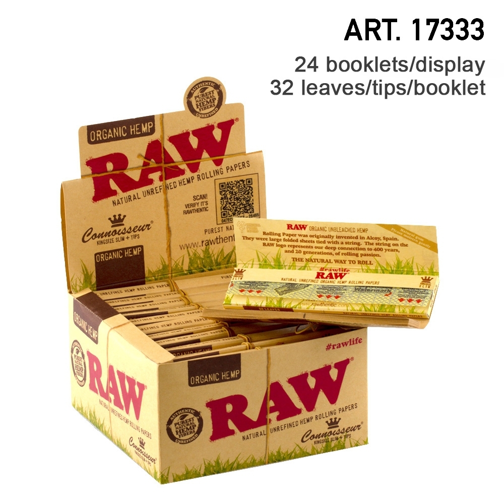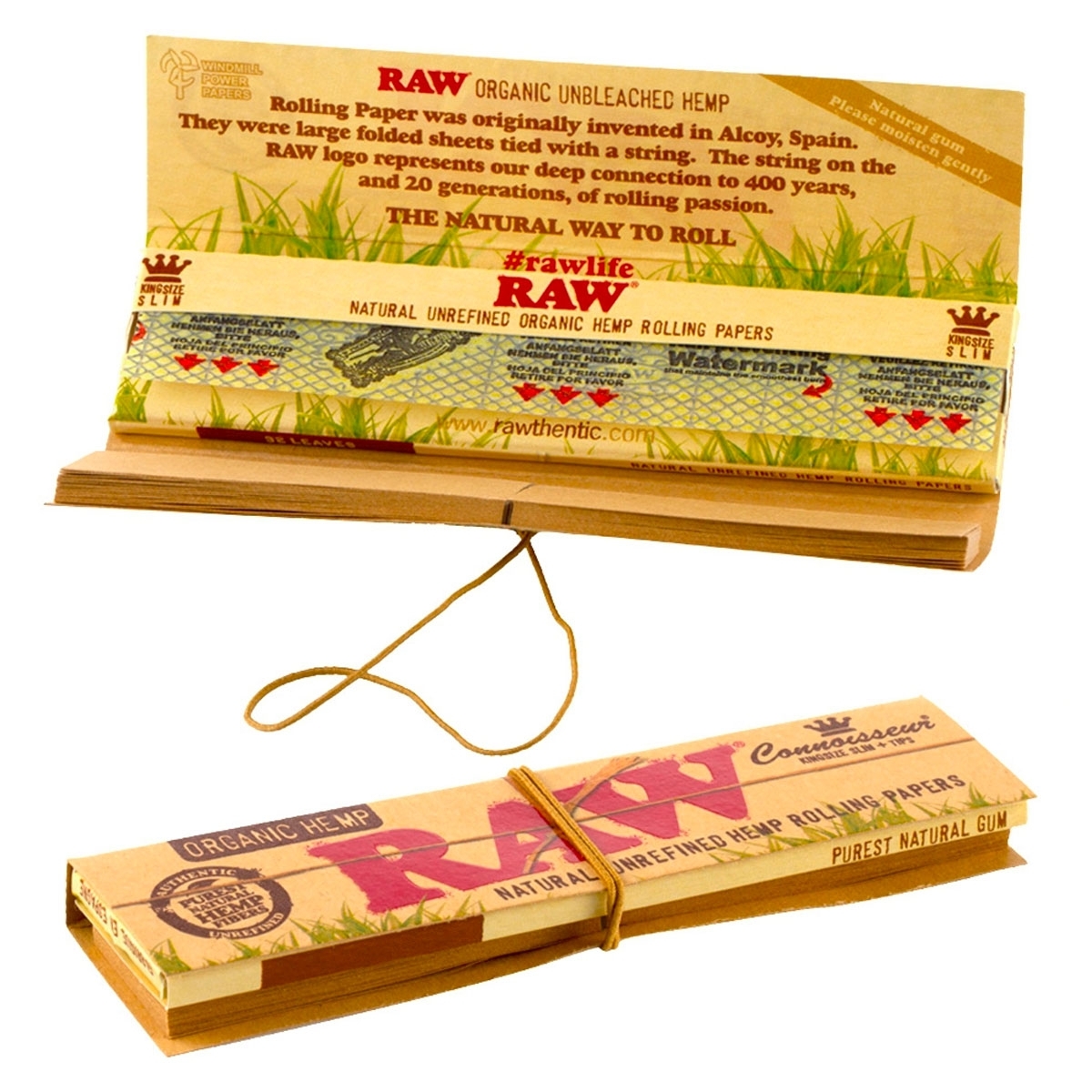 RAW Organic Connoisseur King Size Slim papers with filter tips offer a natural unbleached roll using hemp grown without pesticides. Each booklet contains 32 slim leaves made from pure organic hemp along with matching perforated filter tips kept together in a tidy pull out stack. The papers feature the familiar RAW watermark for an even slow burn and a light taste that does not interfere with your blend. A simple elastic strap keeps everything secure. Sold as part of the Organic Hemp line for those who prefer a cleaner roll made with sustainable materials.